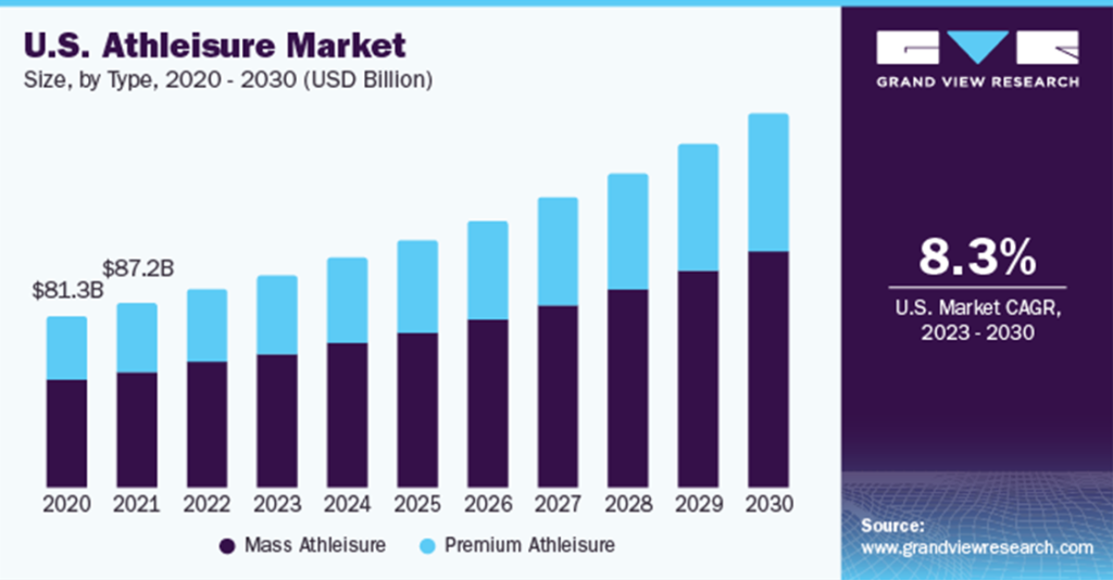 According to a report by Grand View Research, the global athletic wear market size was valued at $155.2 billion in 2020 and is expected to grow at a compound annual growth rate (CAGR) of 5.9% from 2021 to 2028. In the USA, the market is particularly strong, with major brands such as Nike, Adidas, and Under Armour continuing to dominate. In the United States, the athleisure and athletic wear market is expected to to 8.3% from 2023 to 2030.